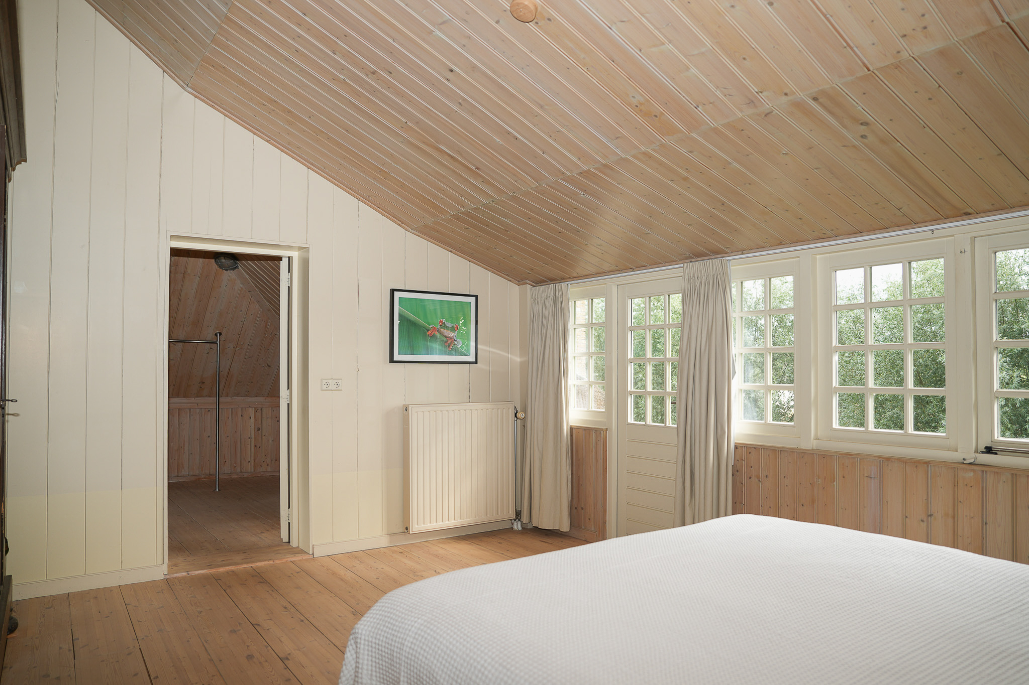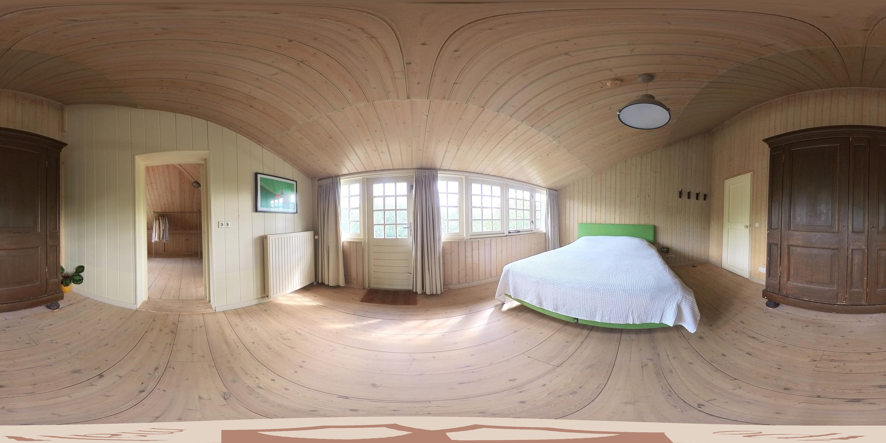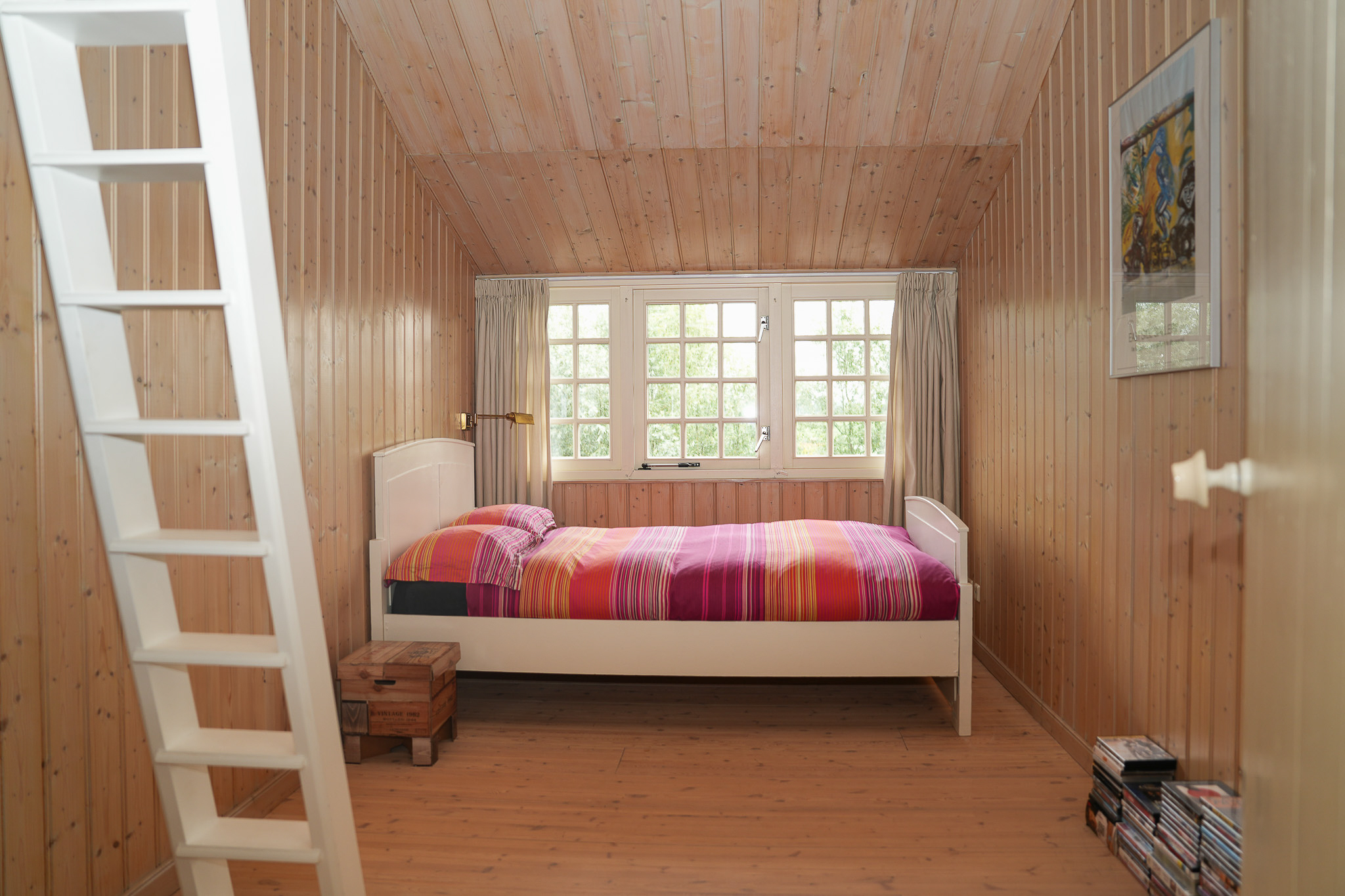 De slaapkamer aan de oostzijde beslaat de volledige diepte van het huis en is voorzien van vaste kasten onder de kap. De ouderslaapkamer grenst aan een breed balkon en aan een kamer die nu in gebruik is als kleedkamer. Deze ruimte leent zich ook uitstekend als extra werkkamer of badkamer.