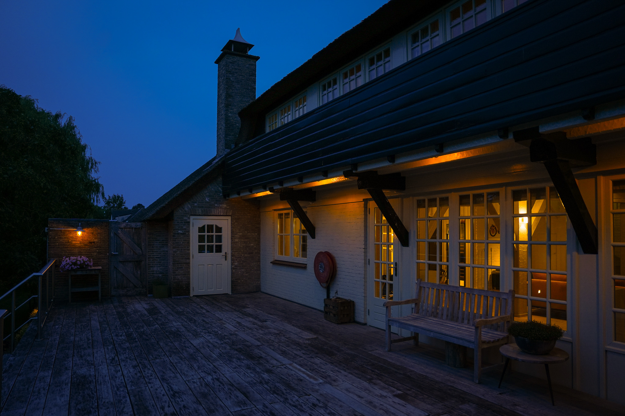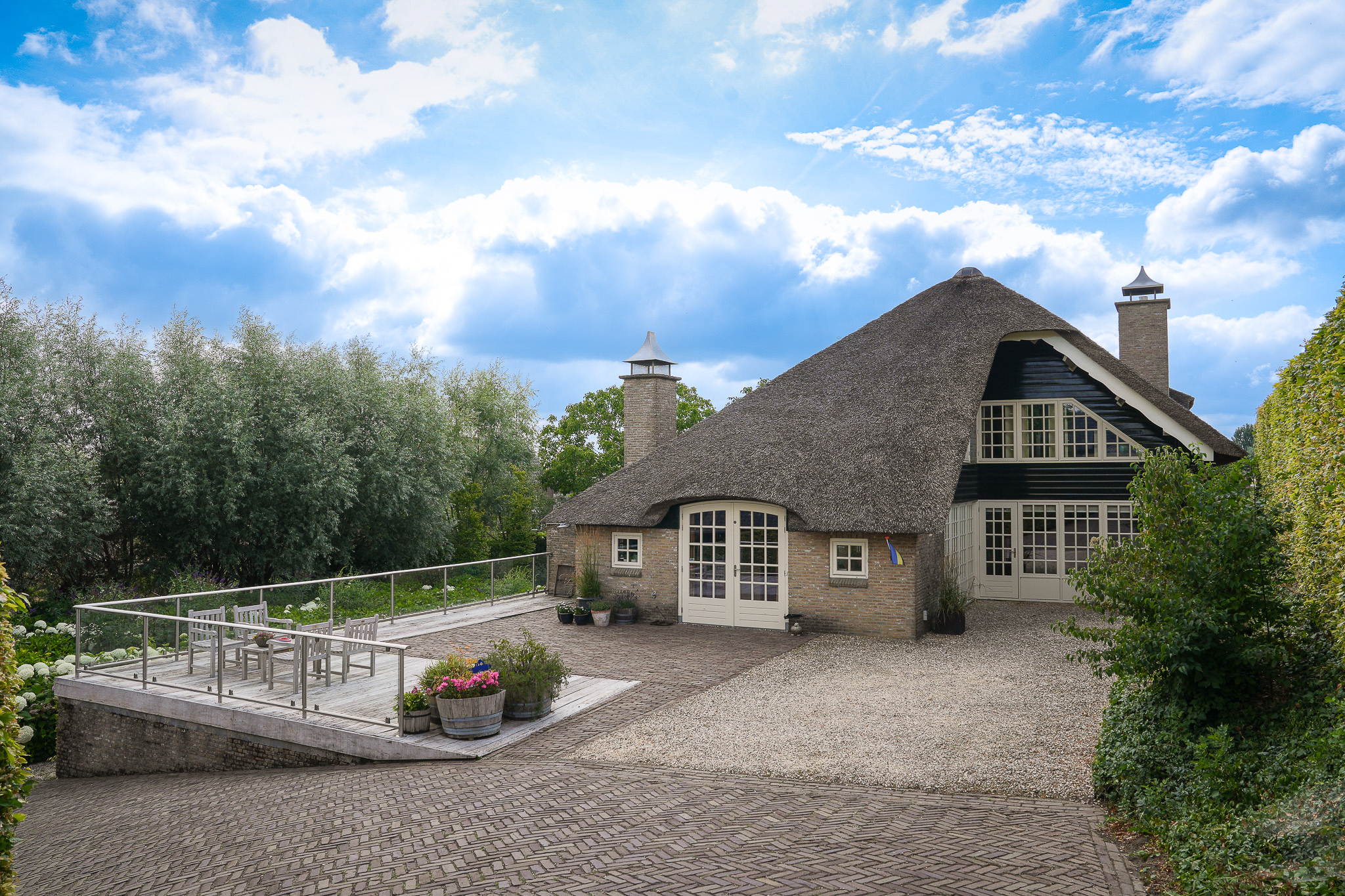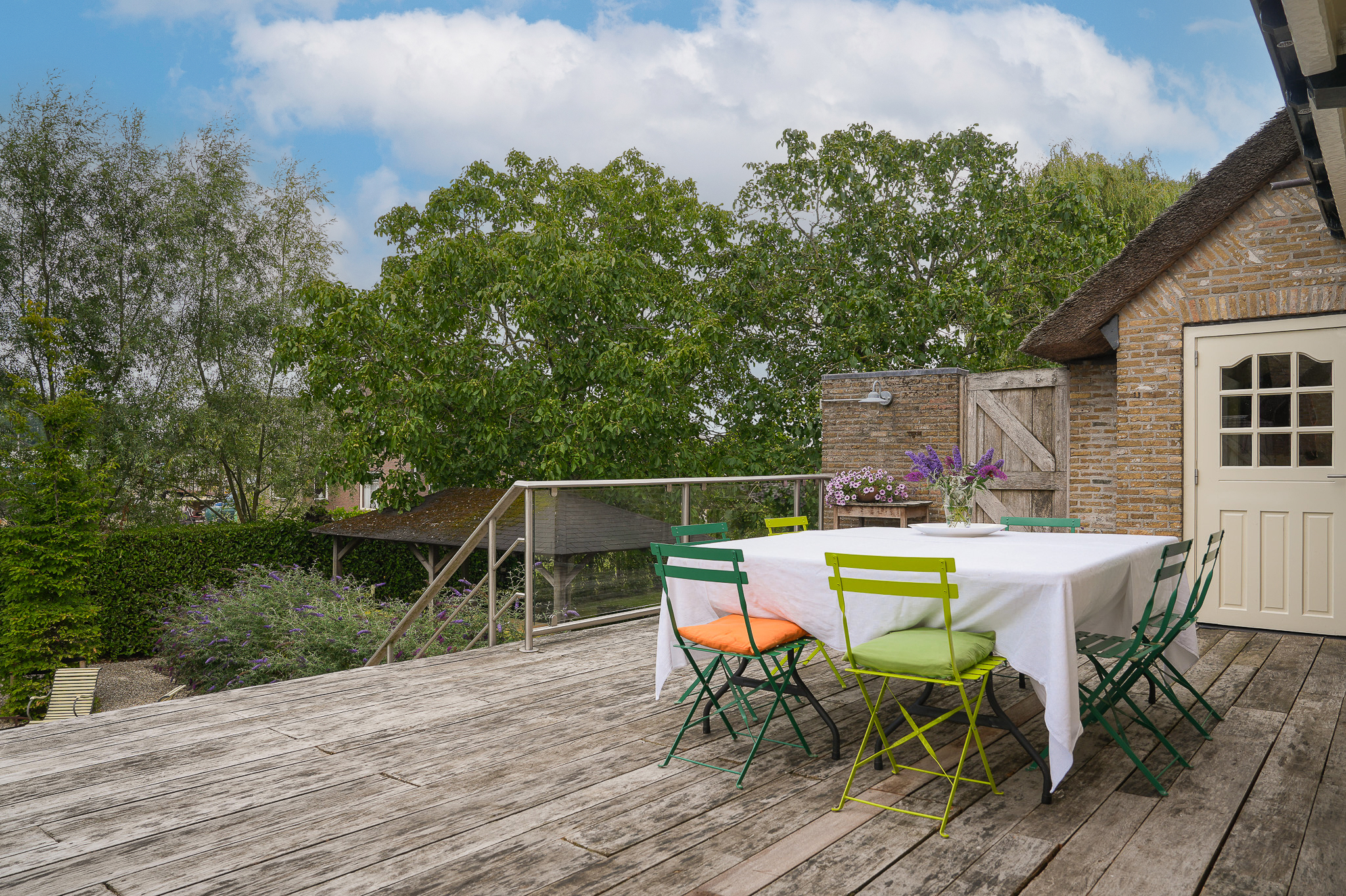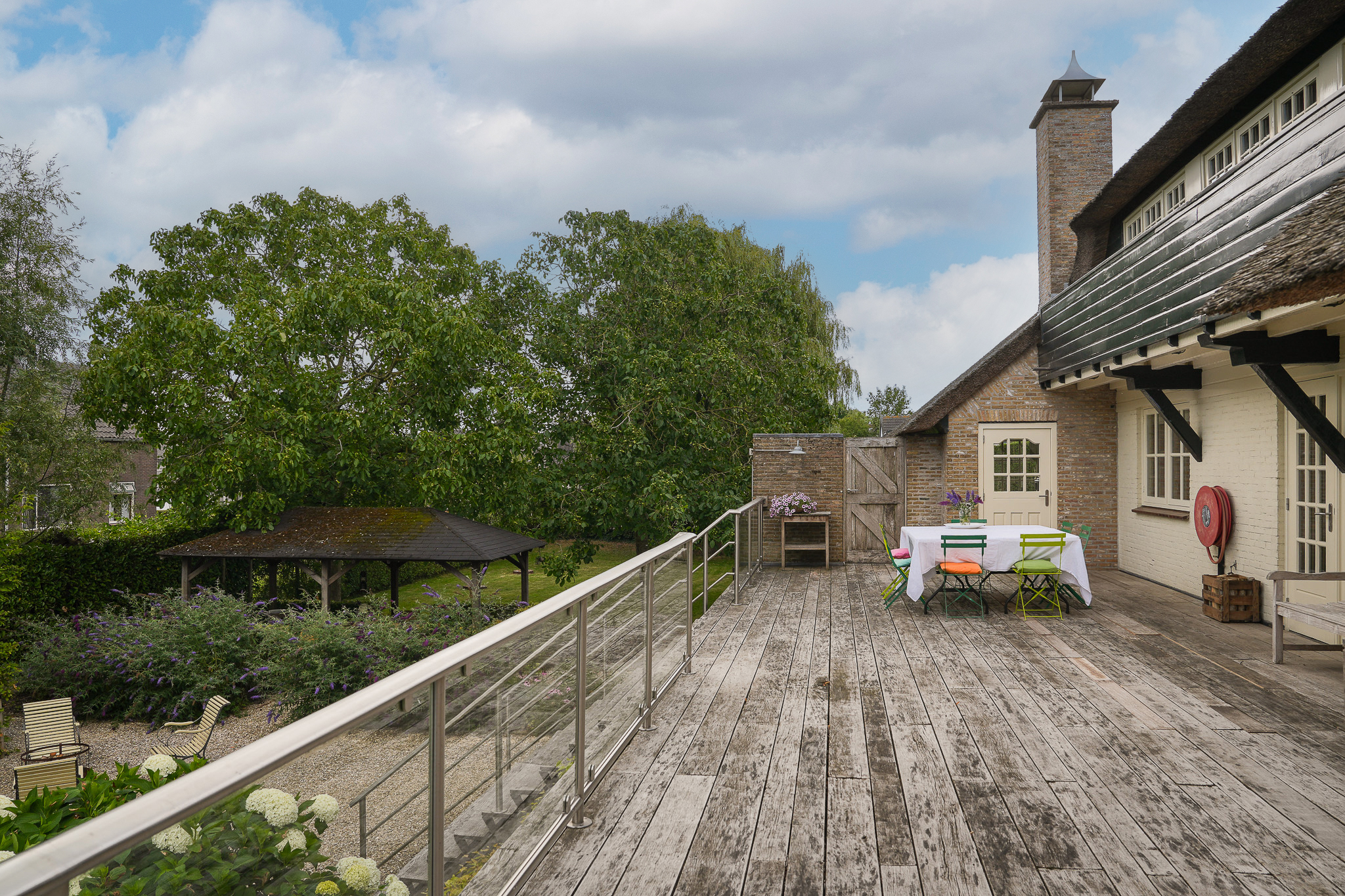 De entree bevindt zich aan de achterzijde, bij het verhoogd gelegen hardhouten terras.