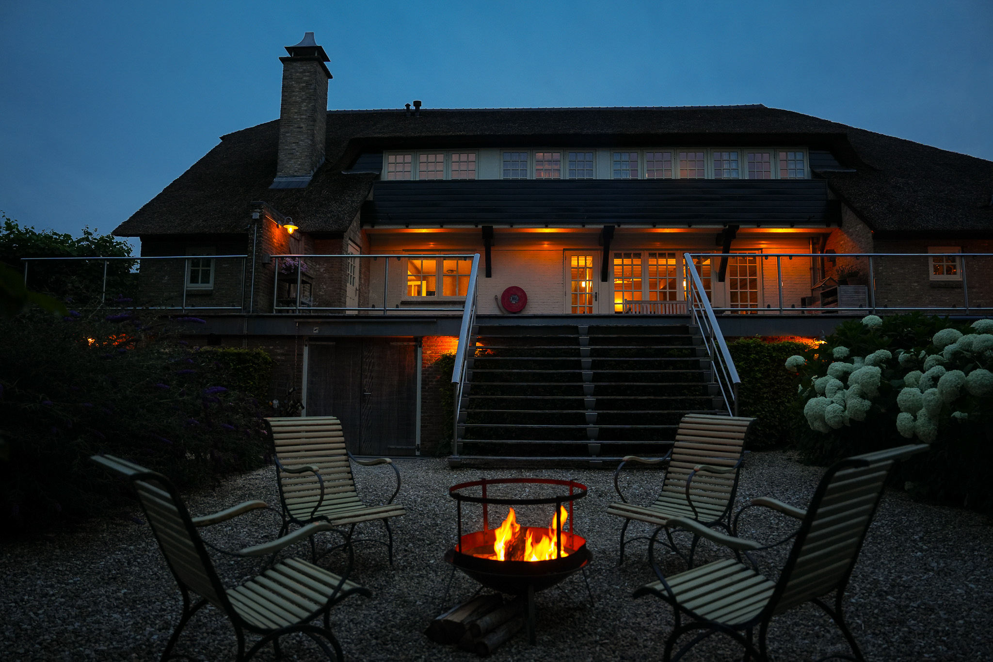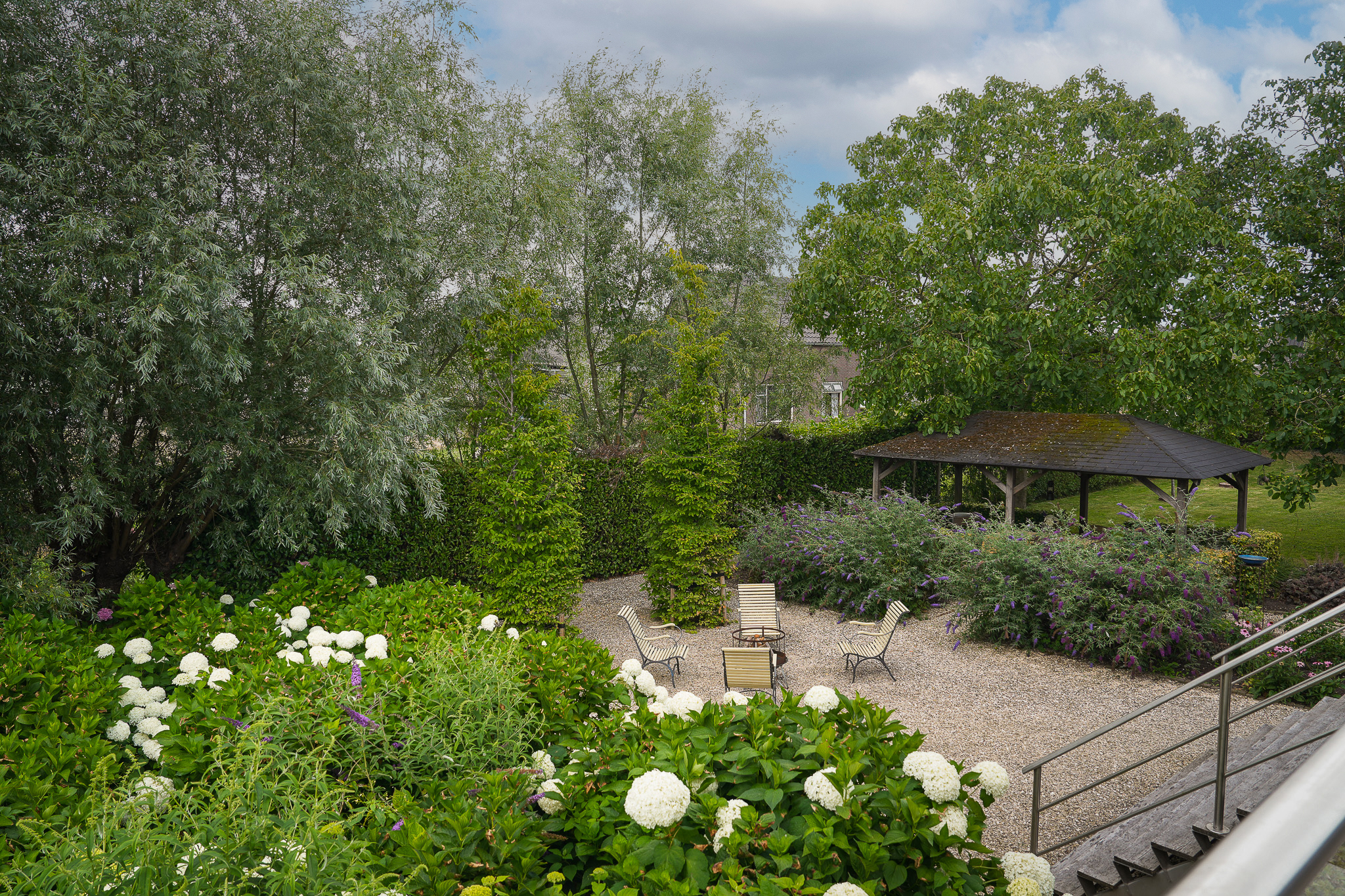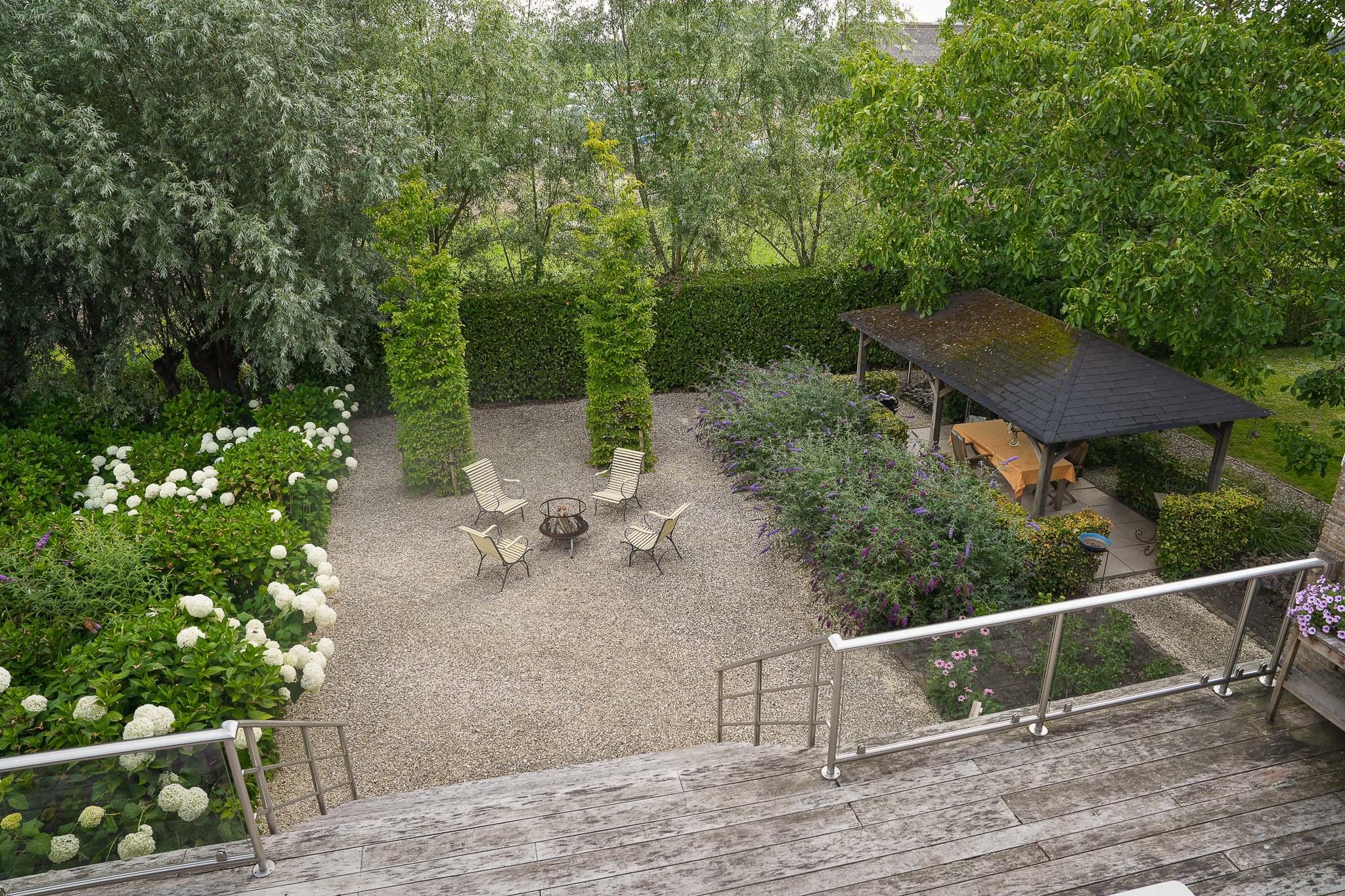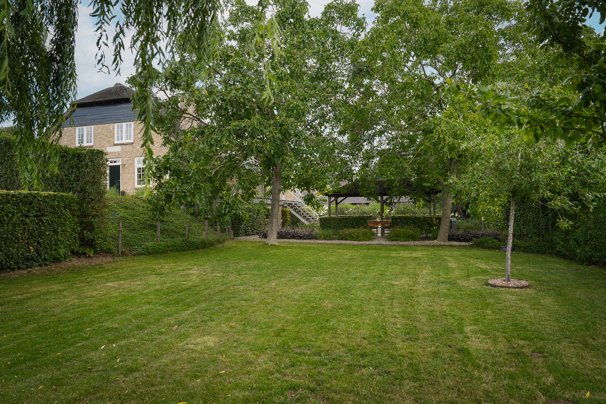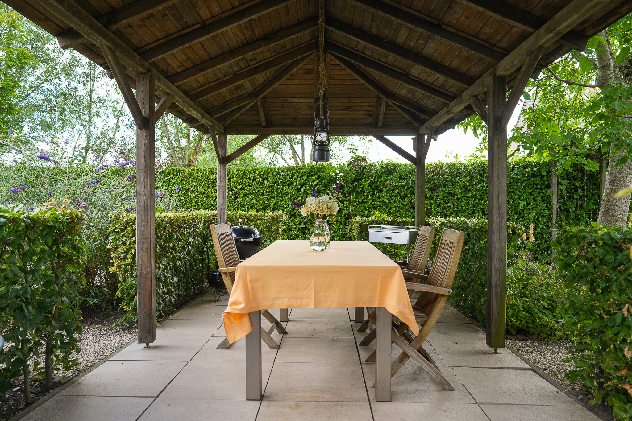 De entree bevindt zich aan de achterzijde, bij het verhoogd gelegen hardhouten terras.