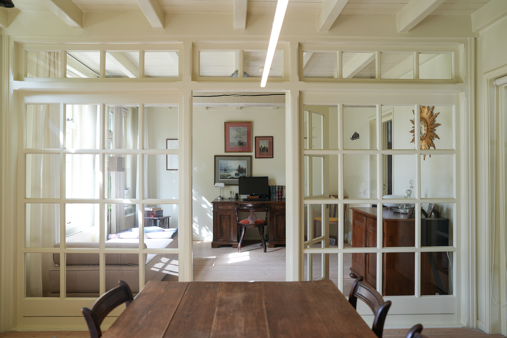 Aan de voorzijde liggen twee multifunctionele kamers, visueel verbonden door een glaswand.