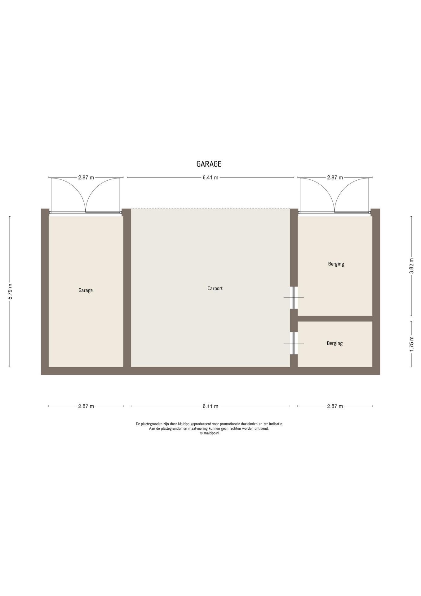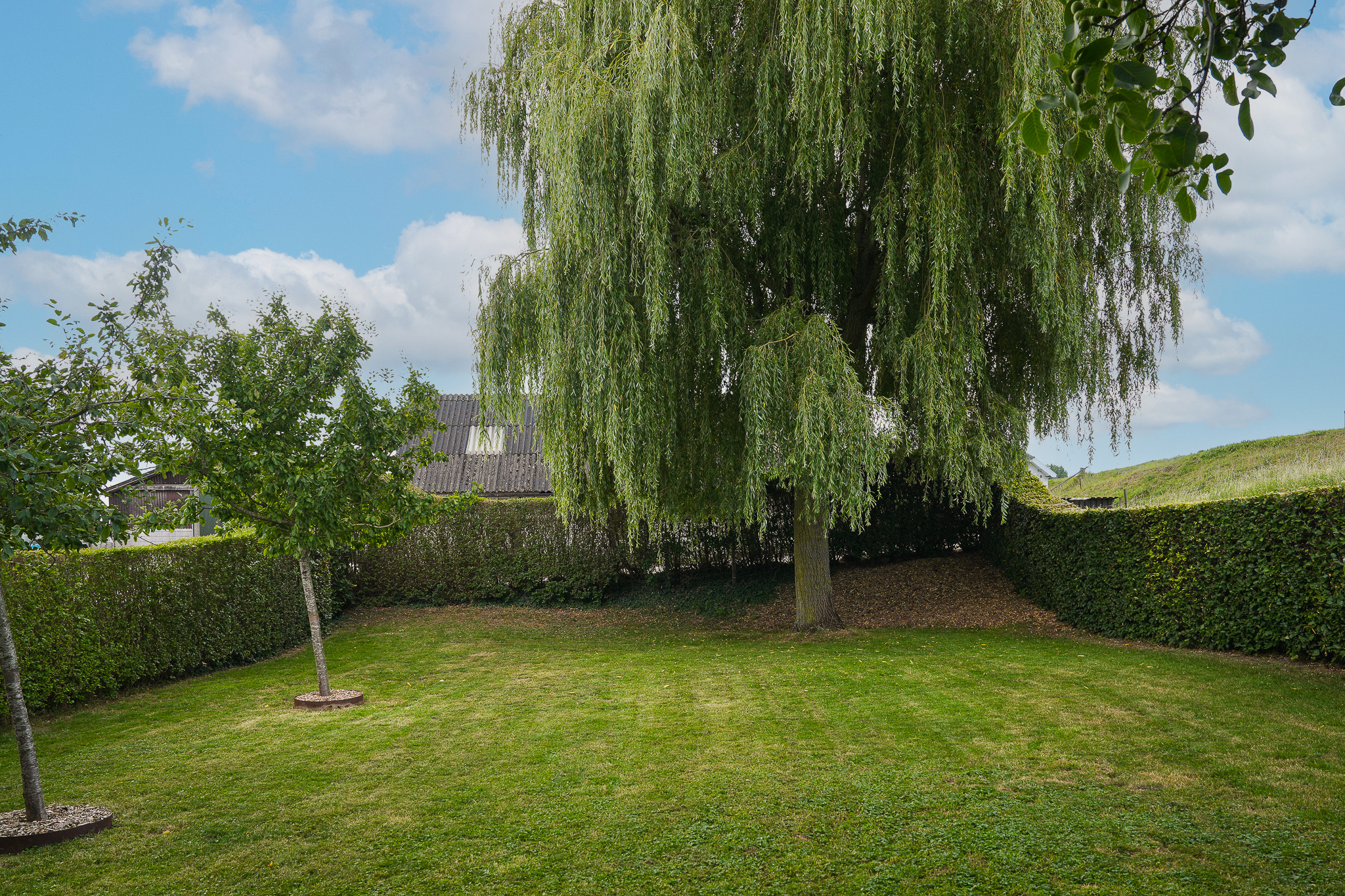 Links van de oprit staat een solide pannengedekt bijgebouw met een dubbele carport, een garage en een motor- en fietsenberging. De tuin is onderhoudsvriendelijk aangelegd met grote hardhouten terrassen, transparante RVS-balustrades, sierlijke hortensiaborders en een gazon met volwassen beplanting. Het talud langs de dijk is ingeplant met onder andere maagdenpalm en goudaardbei. Het dak van het bijgebouw leent zich door de oost/west-oriëntatie bij uitstek voor het plaatsen van zonnepanelen. Bij plaatsing van ten minste 4 zonnenpanelen, gaat het huidige energielabel C naar B.