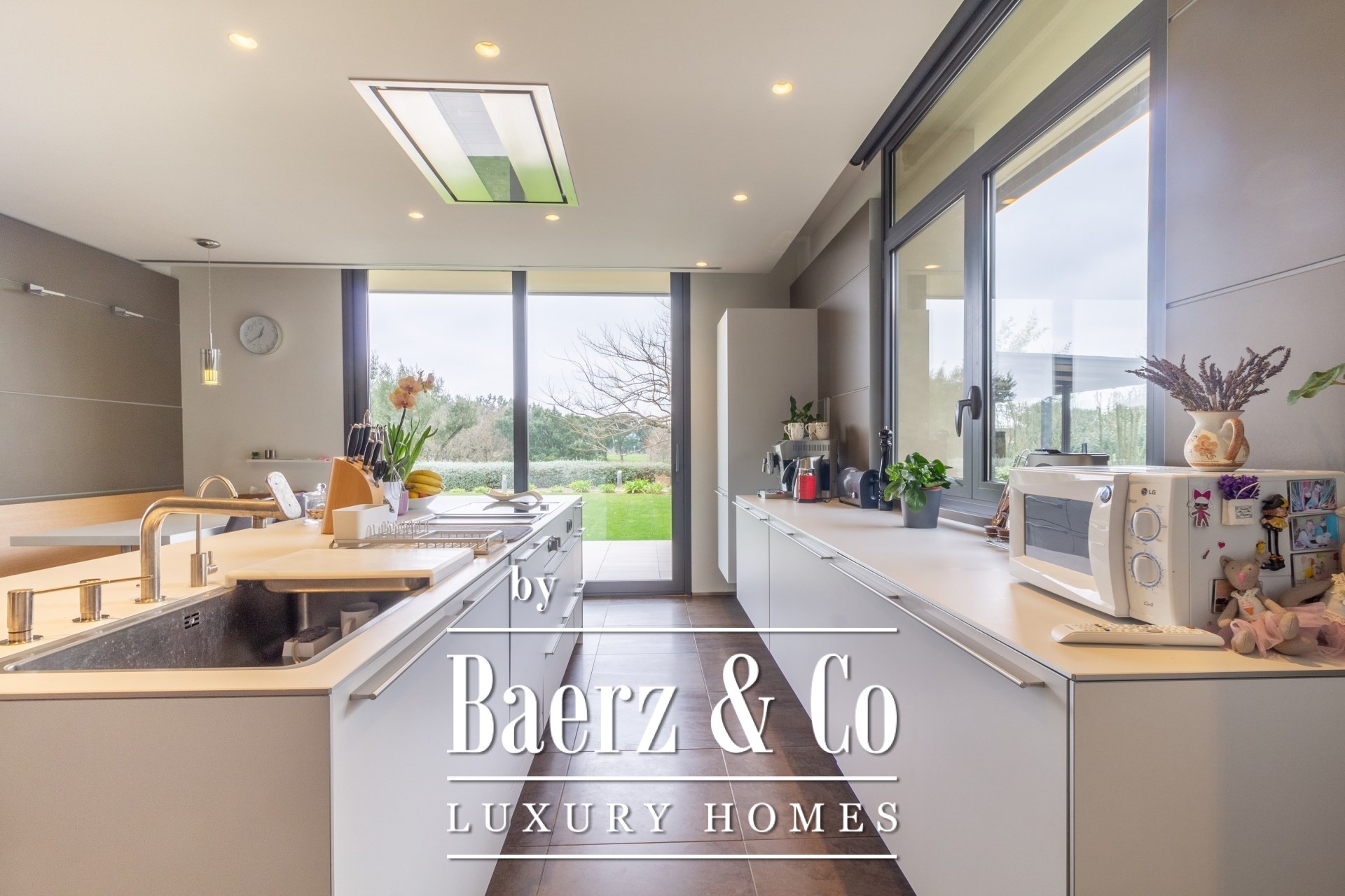 Впечатляющий холл ведет на главный уровень, где гостиная и столовая объединены в единое светлое пространство с панорамными видами на сад и бассейн. Уютная зона для чтения с камином располагает к уединению. Кухня выделяется премиальной техникой и безупречной отделкой, рассчитана на кулинарное мастерство. На первом этаже расположены две спальни с ванными комнатами, обеспечивающие приватность и комфорт, гостевая ванная и отдельный кабинет.
