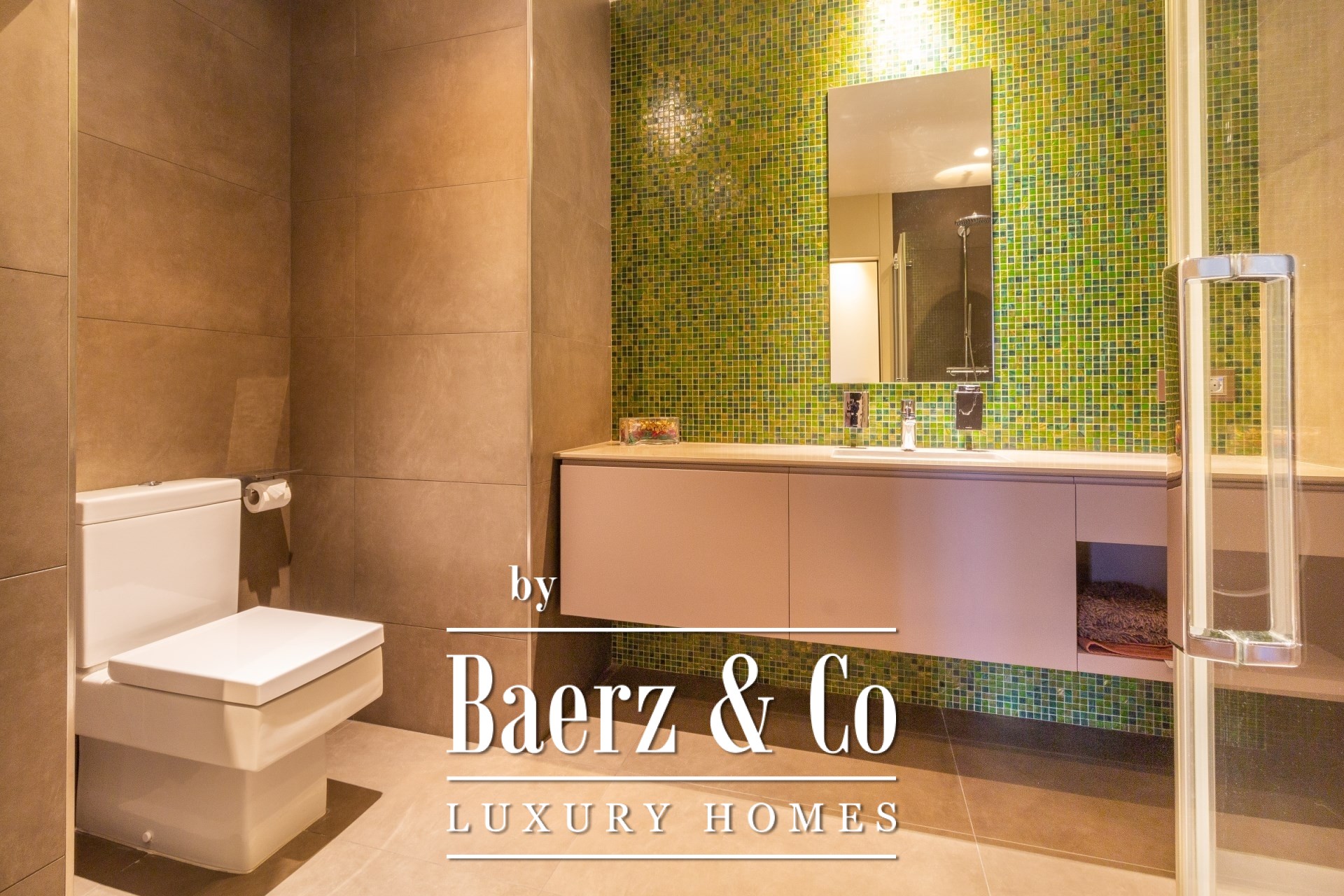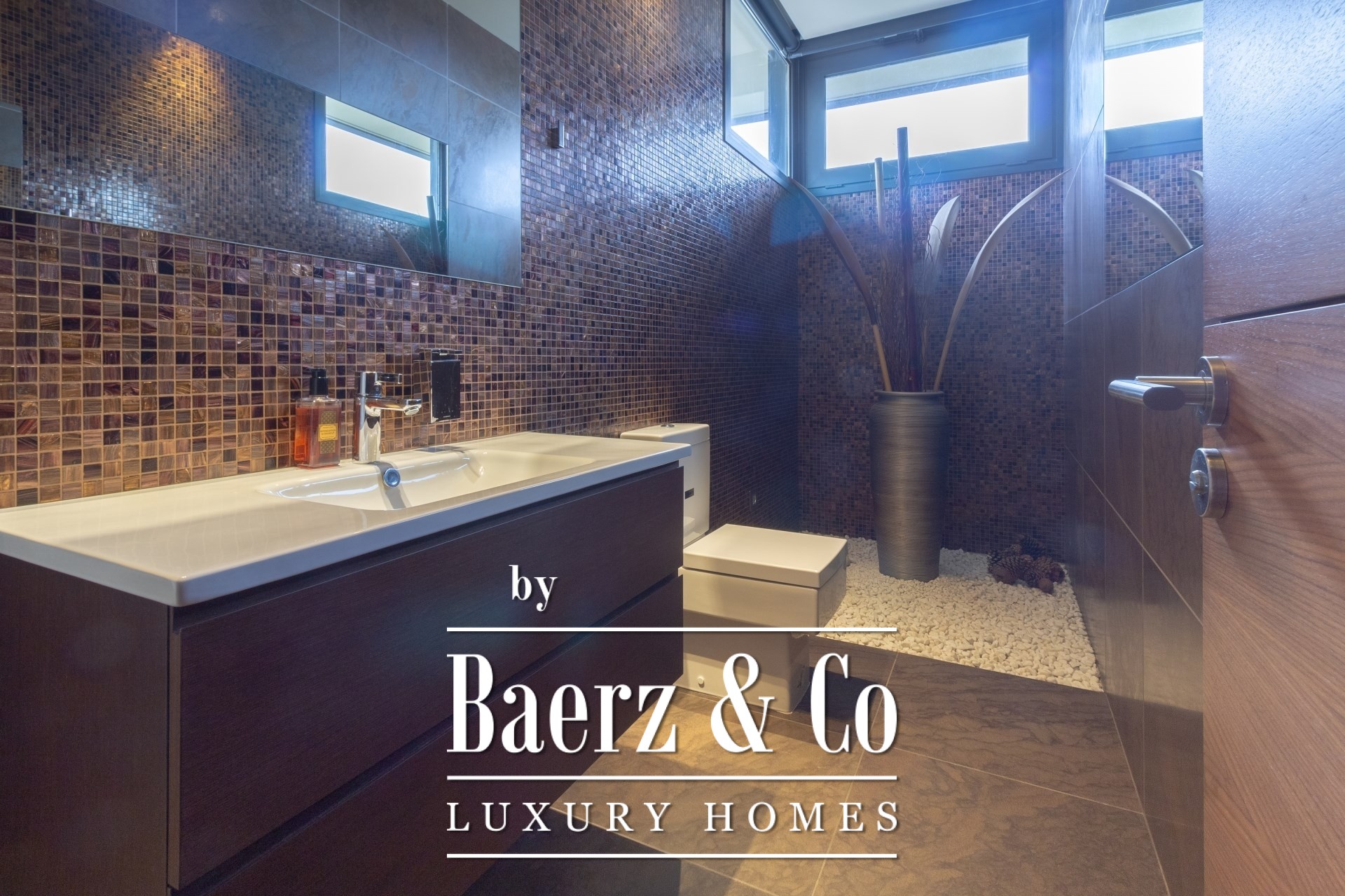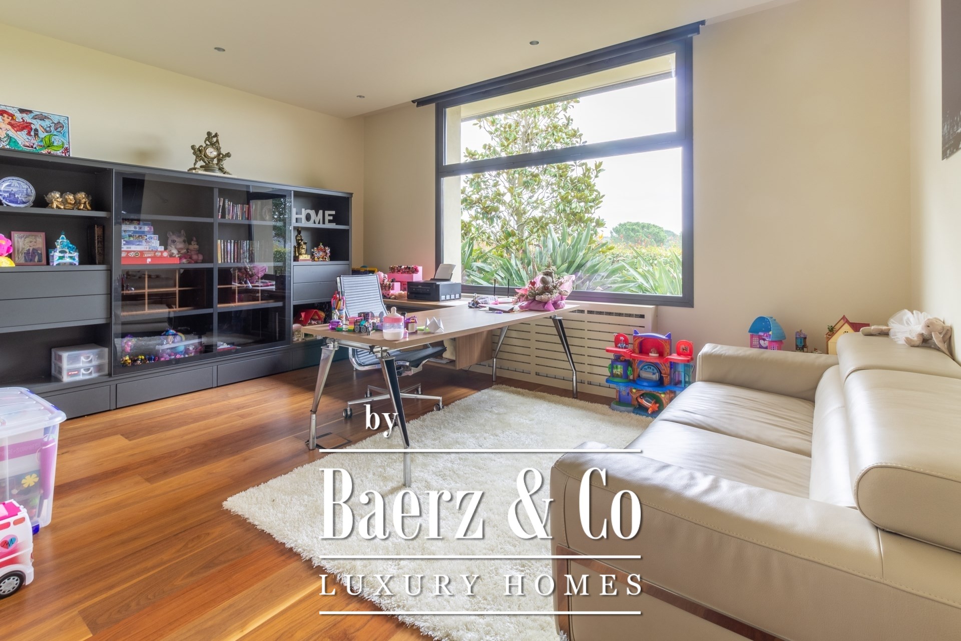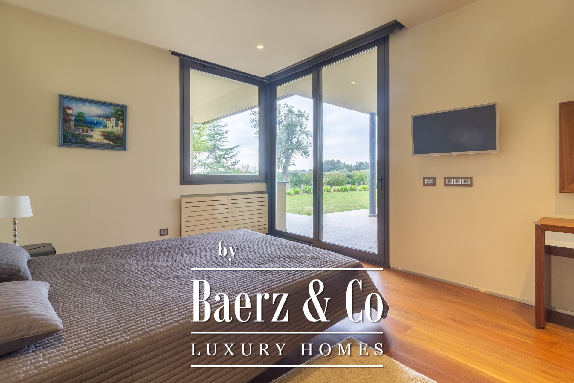 Снаружи ухоженный сад окружает бассейн с водопадом, барбекю и летней кухней, а также просторными зонами для отдыха. Теплый пол, центральное кондиционирование, электроприводы окон, интегрированная аудиосистема, полный видеомониторинг и лифт подчеркивают высочайший уровень комфорта и безопасности.