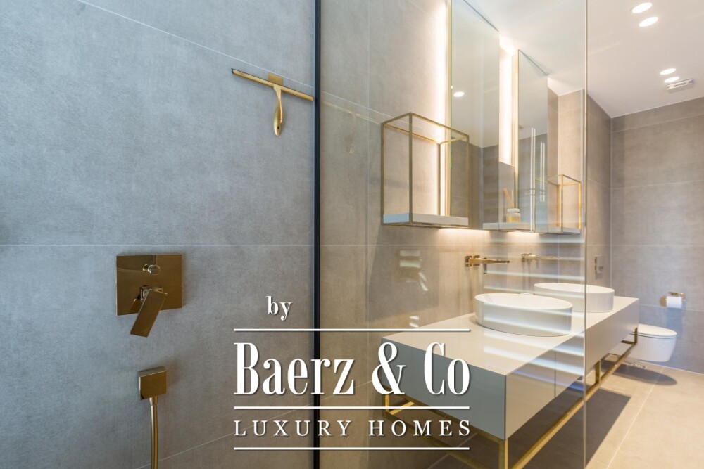 一楼布局包括四间宽敞卧室,每间各具独立卫浴,呈现低调奢华格调。卫浴空间搭配Villeroy&Boch洁具与Hansgrohe金色龙头,步入式淋浴与定制玻璃或木质门,尽显考究品质。全屋的灯光与墙面处理烘托私密氛围;地暖系统由热泵驱动,保证四季舒适体验。